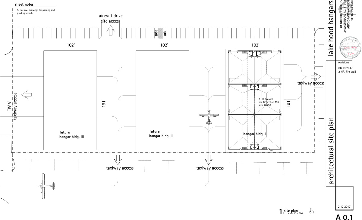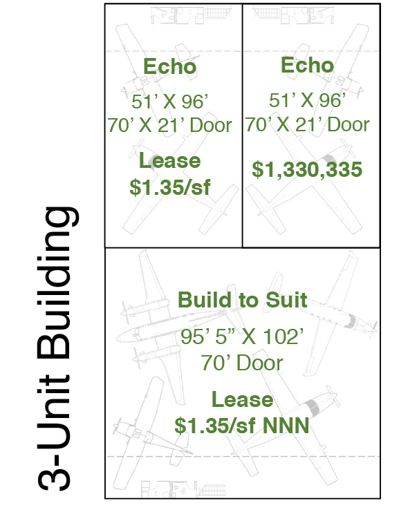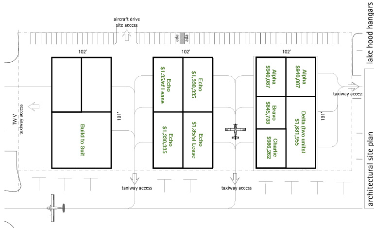 Demising walls are light gauge metal studs with insulation between hangars. All interior walls are gypsum wallboard, taped and painted. Finished restrooms with shower, floor drains in each Unit. Oil-water separator in each building.
